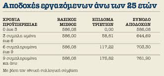 * Με 0 έως 2 έτη υπηρεσίας μισθός 1.010 ευρώ * Με 2 έως 4 έτη μισθός 1.080 ευρώ * Με 4 έως 6 έτη μισθός 1.150 ευρώ * Με 6 έως 8 έτη μισθός 1.230 ευρώ * Με 8 έως 10 έτη μισθός 1.300 ευρώ * Με 10 έως 12 έτη μισθός 1.380 ευρώ * Με 12 έως 14 έτη μισθός 1.415 ευρώ * Με 14 έως 16 έτη ο βασικός μισθό ορίζεται στα 1.495 ευρώ * Με 16 έως 18 έτη ο βασικός στα 1.590 ευρώ * Με 18 έως 20 έτη μισθός 1.630 ευρώ * Με 20 έως 22 έτη μισθός 1.675 ευρώ * Με 22 έως 24 έτη μισθός 1.740 ευρώ * Με 24 έως 26 έτη μισθός 1.800 ευρώ * Με 26 έως 28 έτη μισθός 1.900 ευρώ * Με 28 έως 30 έτη μισθός 2.015 ευρώ * Με 30 έως 32 έτη μισθός 2.085 ευρώ * Με 32 έως 34 έτη μισθός 2.180 ευρώ * Με 34 έως 36 έτη μισθός 2.270 ευρώ * Με 36 έως 38 έτη μισθός 2.360 ευρώ * Με 38 έως 40 έτη προϋπηρεσίας ο βασικός μισθός ορίζεται στα 2.480 ευρώ και * Με 41 και άνω έτη ο μισθός καθορίζεται στα 2.585 ευρώ Πηγή: Ελεύθερος Τύπος