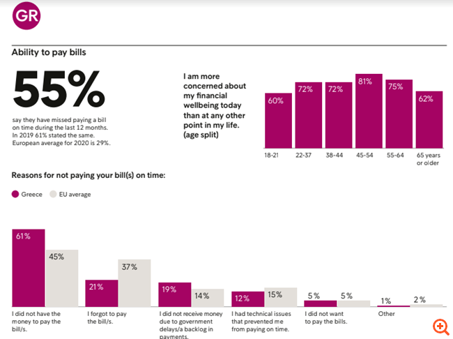 Τέλος, σχεδόν 7 στους 10 Έλληνες καταναλωτές δηλώνουν ότι παρά την πανδημία, υπήρξε αύξηση των υποχρεώσεων για πληρωμές που επέδρασε αρνητικά στον προϋπολογισμό των νοικοκυριών τους, έναντι 47% στην υπόλοιπη Ευρώπη.