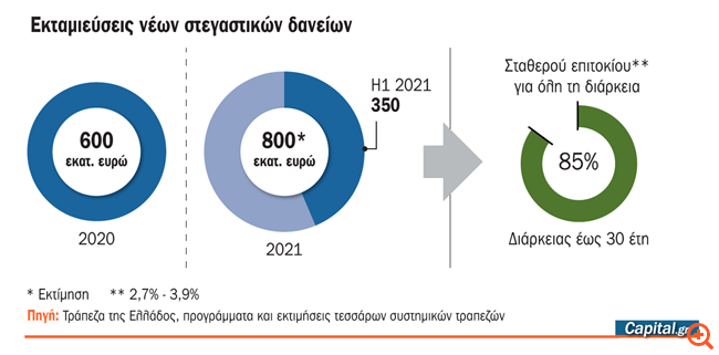 Οι τράπεζες εκτιμούν ότι εντός του 2021 τα νέα στεγαστικά δάνεια θα ξεπεράσουν τα 800 εκατ. ευρώ, καθώς στο πρώτο τρίμηνο του έτους η αγορά ήταν παγωμένη λόγω του τελευταίου lockdown, ενώ ο Δεκέμβριος παραδοσιακά παρουσιάζει τις περισσότερες εκταμιεύσεις. Σύμφωνα με τις ίδιες εκτιμήσεις, οι συνολικές εκταμιεύσεις προς νοικοκυριά (στεγαστικά και καταναλωτικά) θα ξεπεράσουν φέτος συνολικά το 1,5 δισ. ευρώ.