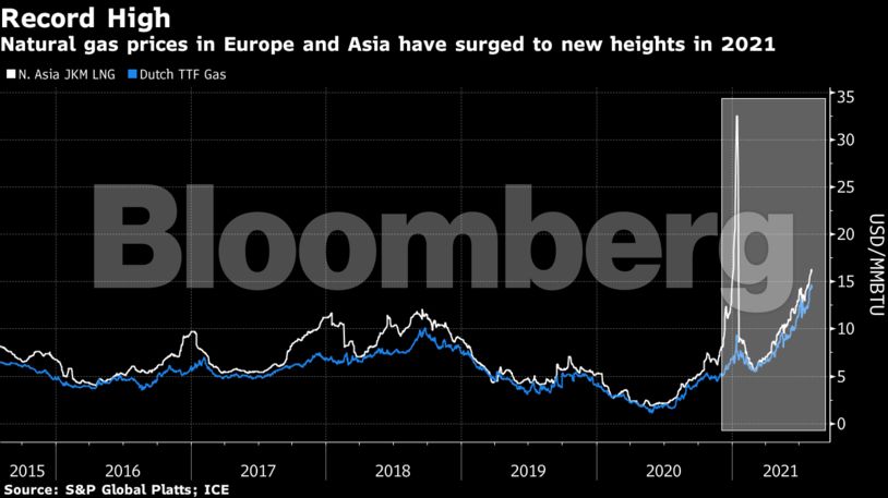 Στην Ευρώπη, οι τιμές του φυσικού αερίου έχουν αυξηθεί κατά 1.000% από τα χαμηλά τον Μάιο του 2020 λόγω της πανδημίας, ενώ στην Ασία οι τιμές του LNG έχουν εξαπλασιαστεί το τελευταίο έτος. Ακόμη και στις ΗΠΑ όπου οι τιμές κυμαίνονταν σε χαμηλά επίπεδα λόγω της τεχνολογίας άντλησής του, έχουν φτάσει σε ρεκόρ δεκαετίας.