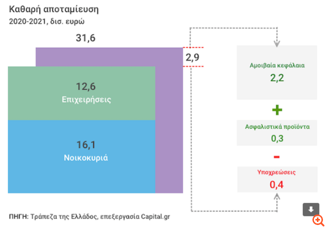 Συνολικά, νοικοκυριά και επιχειρήσεις έχουν αυξήσει τις καταθέσεις τους από την αρχή της πανδημίας κατά 28,7 δισ. ευρώ, δηλαδή σημειώνεται κάμψη κατά περίπου 3 δισ. ευρώ από το μέγιστο σημείο. Αυτά τα 3 δισ. ευρώ έχουν κατευθυνθεί κυρίως προς αμοιβαία κεφάλαια (2,3 δισ. ευρώ) και ασφαλιστικά προϊόντα (300 εκατ. ευρώ), σύμφωνα με στοιχεία της Ένωσης Θεσμικών Επενδυτών και της Ένωσης Ασφαλιστικών Εταιρειών. Ένα υπόλοιπο της τάξεως του μισού δισ. ευρώ έχει χρησιμοποιηθεί για υποχρεώσεις και κατανάλωση.