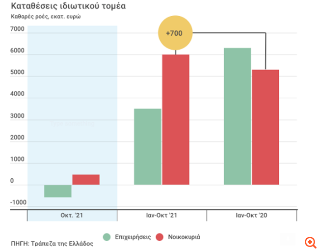 Στα νοικοκυρά, η αύξηση των καταθέσεων τον Οκτώβριο ήταν 465 δισ. ευρώ, συνεχίζοντας, με τις αποταμιεύσεις στο δεκάμηνο να έχουν αυξηθεί κατά 6 δισ. ευρώ, έναντι 5,3 δισ. ευρώ στο αντίστοιχο διάστημα του 2020. Δηλαδή, ο ρυθμός αύξησης των καταθέσεων των νοικοκυριών το 2021 ήταν υψηλότερος κατά περίπου 700 εκατ. ευρώ, σε σχέση με το 2020, σε αντίθεση με τις προβλέψεις ότι θα υπήρχε μείωση λόγω του ανοίγματος της αγοράς. Αυτό το στοιχείο έρχεται να επιβεβαιώσει το συμπέρασμα της ΕΚΤ.