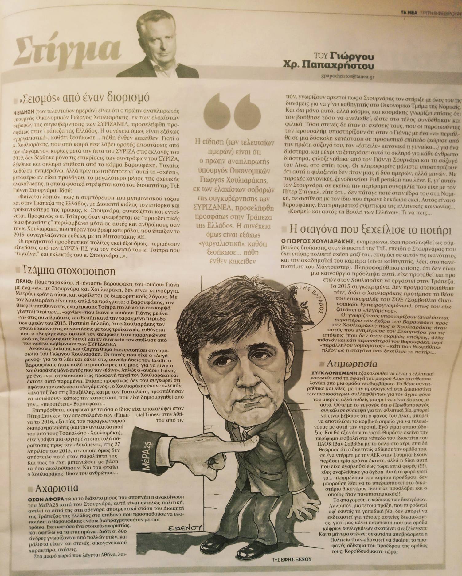 Σε δημοσίευμα της εφημερίδας «Τα Νέα» που αναφέρεται στην αντίδραση του, Γιάνη Βαρουφάκη για το διορισμό του Γιώργου Χουλιαράκη ως συμβούλου του διοικητή της ΤτΕ, απαντάει ο πρώην υπουργός Οικονομικών της κυβέρνησης του ΣΥΡΙΖΑ.