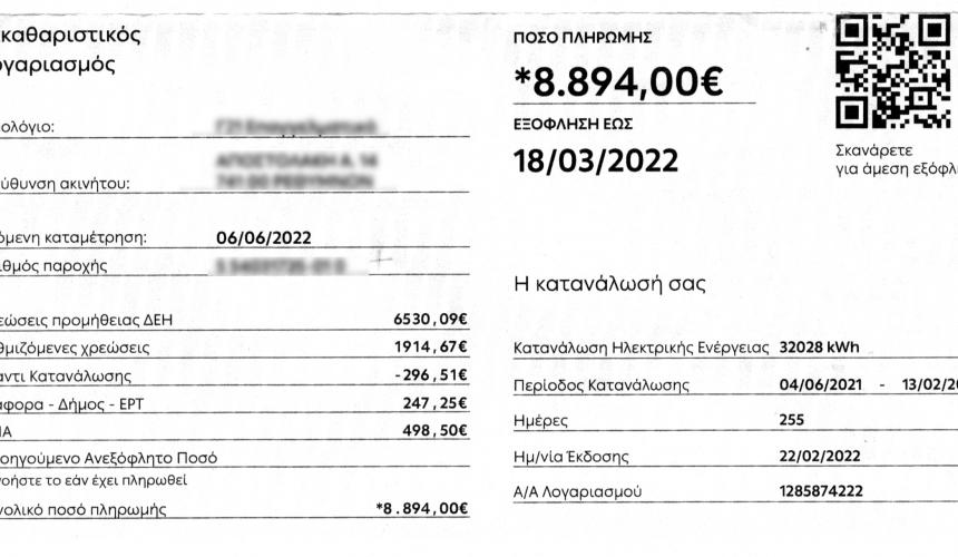 Άνοιξε το φάκελο με τον λογαριασμό ηλεκτρικού ρεύματος και της ήρθε… ίλιγγος! Ο λόγος για συμπολίτισσα, η οποία επισήμως κλήθηκε να πληρώσει 8.894 ευρώ για ρεύμα δύο μηνών και χωρίς να έχει προηγούμενο υπόλοιπο!
