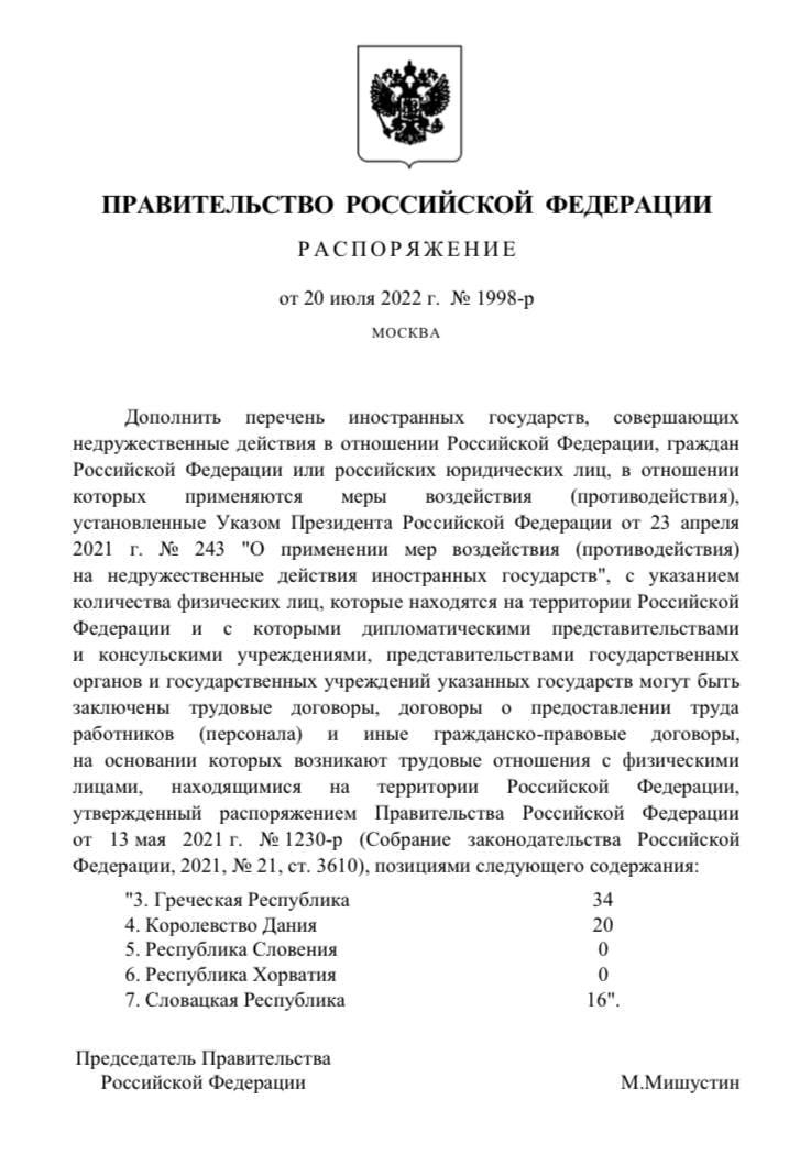 «Η κυβέρνηση ενημέρωσε τον κατάλογο των ξένων κρατών που διαπράττουν εχθρικές ενέργειες κατά των ρωσικών διπλωματικών και προξενικών αποστολών στο εξωτερικό», αναφέρει το διάταγμα που υπέγραψε ο Ρώσος πρωθυπουργός, Mikhail Mishustin.
